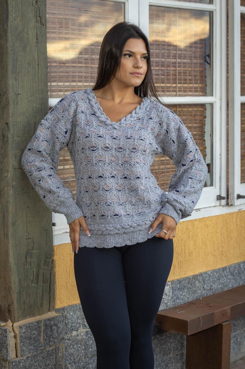 Confeccionada em mousse de alta qualidade, a blusa oferece um toque suave e agradável ao corpo, ideal para as temperaturas mais frias da estação. A gola V adiciona um charme especial, alongando a silhueta e proporcionando um ar de feminilidade e elegância. Os detalhes em trança enriquecem o design, trazendo um toque de exclusividade e estilo à peça.