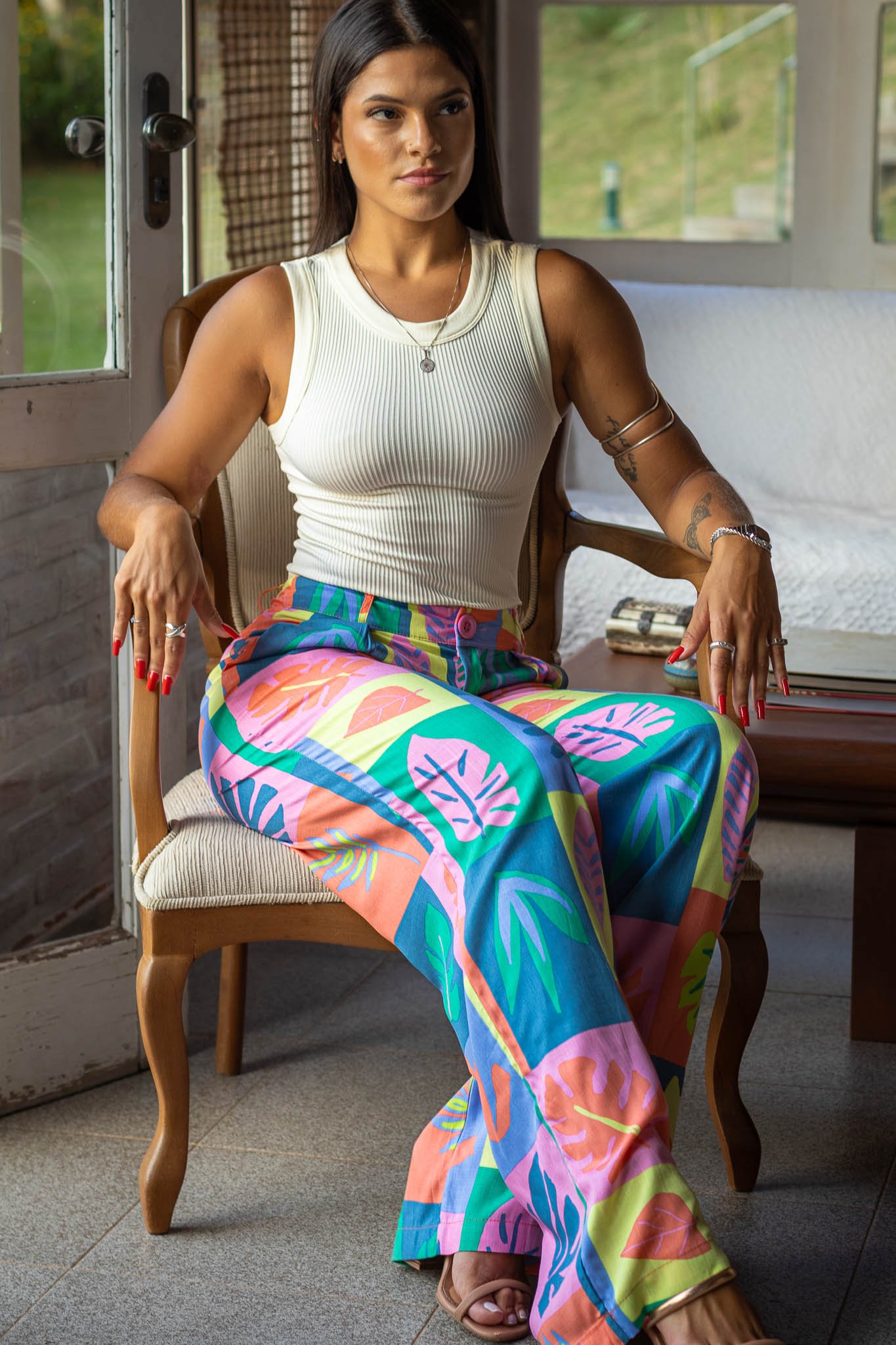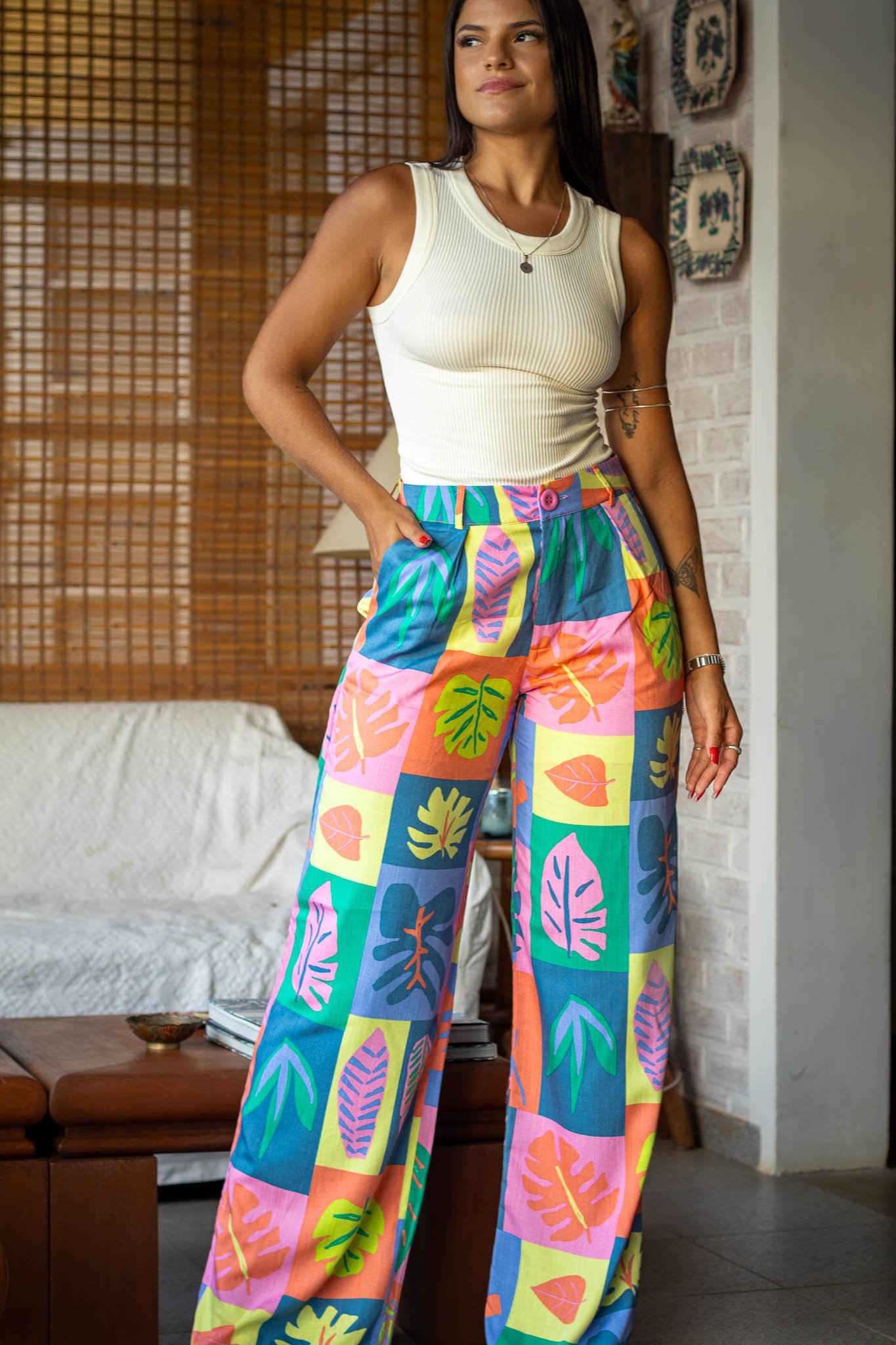 Confeccionada em viscose de alta qualidade e adornada com uma estampa inspirada em folhagens, a Calça Willow é perfeita para quem busca um toque de frescor e sofisticação em seu guarda-roupa. A estampa vibrante não só adiciona um elemento de natureza ao look, mas também faz da peça uma opção versátil, que se adapta bem a diversas ocasiões.
