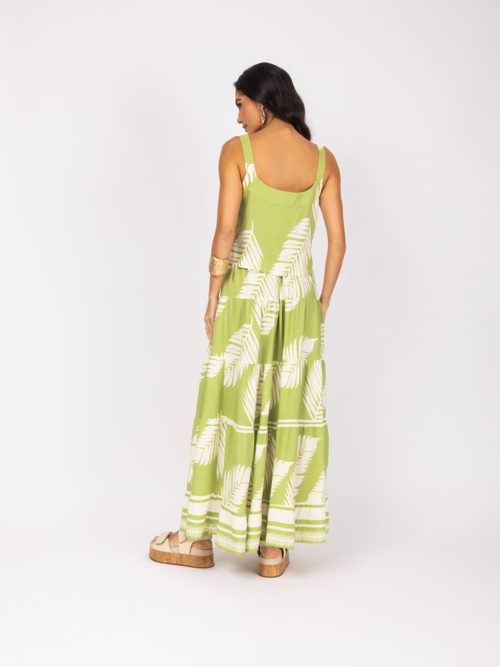 Confeccionado integralmente em viscose de alta qualidade, o conjunto oferece uma experiência sensorial única. Sinta a leveza do tecido, o toque excepcionalmente suave sobre a pele e o caimento fluido que acompanha cada movimento com graciosidade. Ideal para os dias mais quentes, sua respirabilidade garante conforto térmico e frescor contínuo, do amanhecer ao anoitecer.