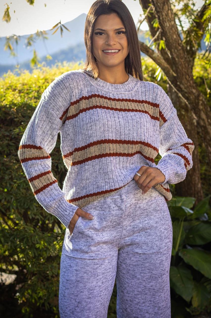 Conjunto Tricot em Mousse – blusa listrada, calça com bolsos, gola canoa
