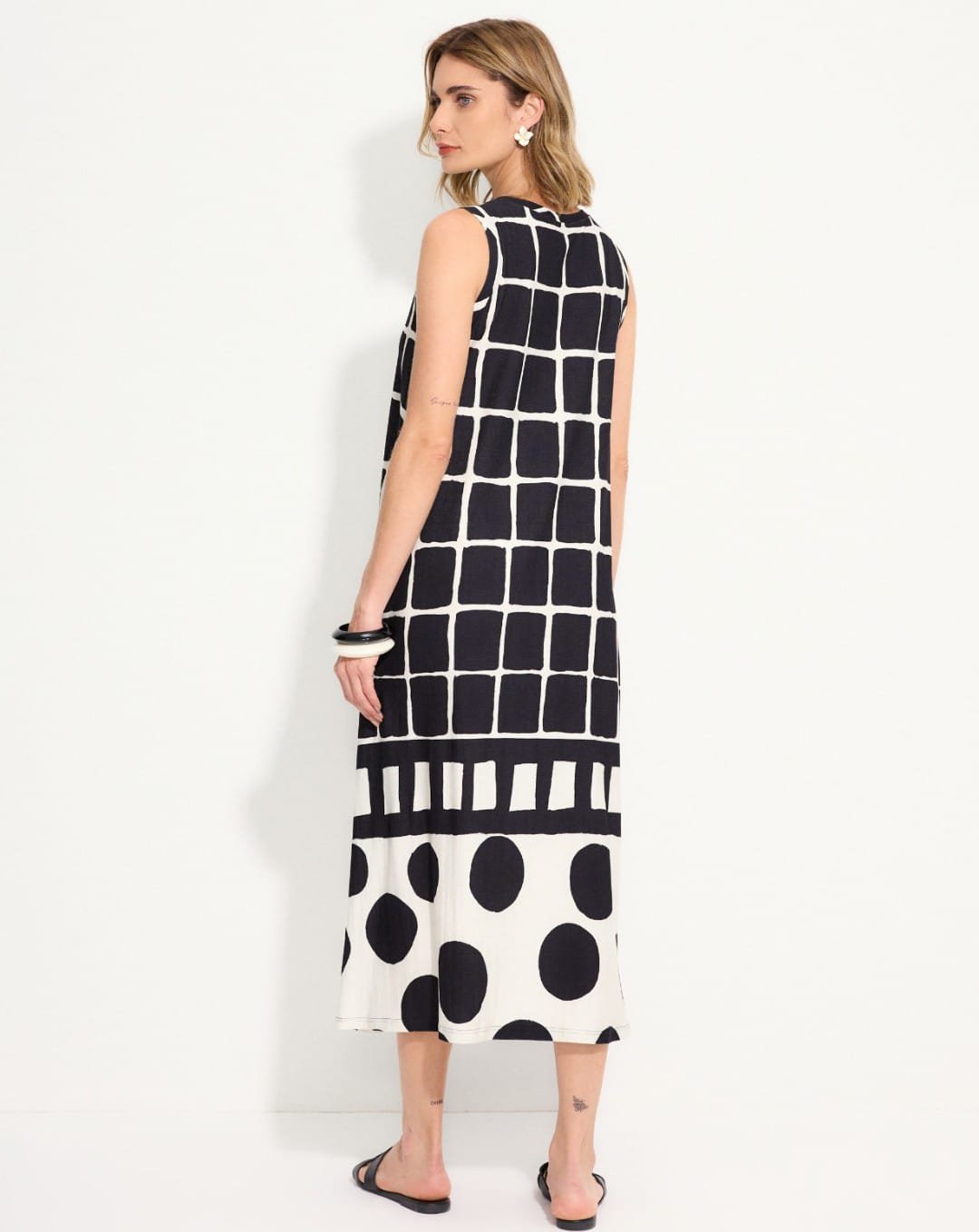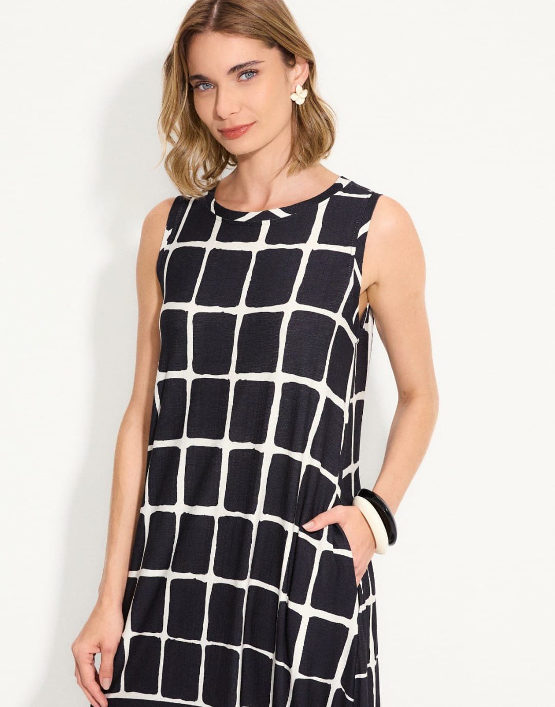 Pensado para o seu bem-estar, este vestido conta com bolsos laterais discretos e funcionais, ideais para guardar pequenos itens com facilidade. A estampa clássica em preto e branco confere um ar sofisticado e versátil, tornando-o perfeito para diversas ocasiões, do trabalho ao lazer.